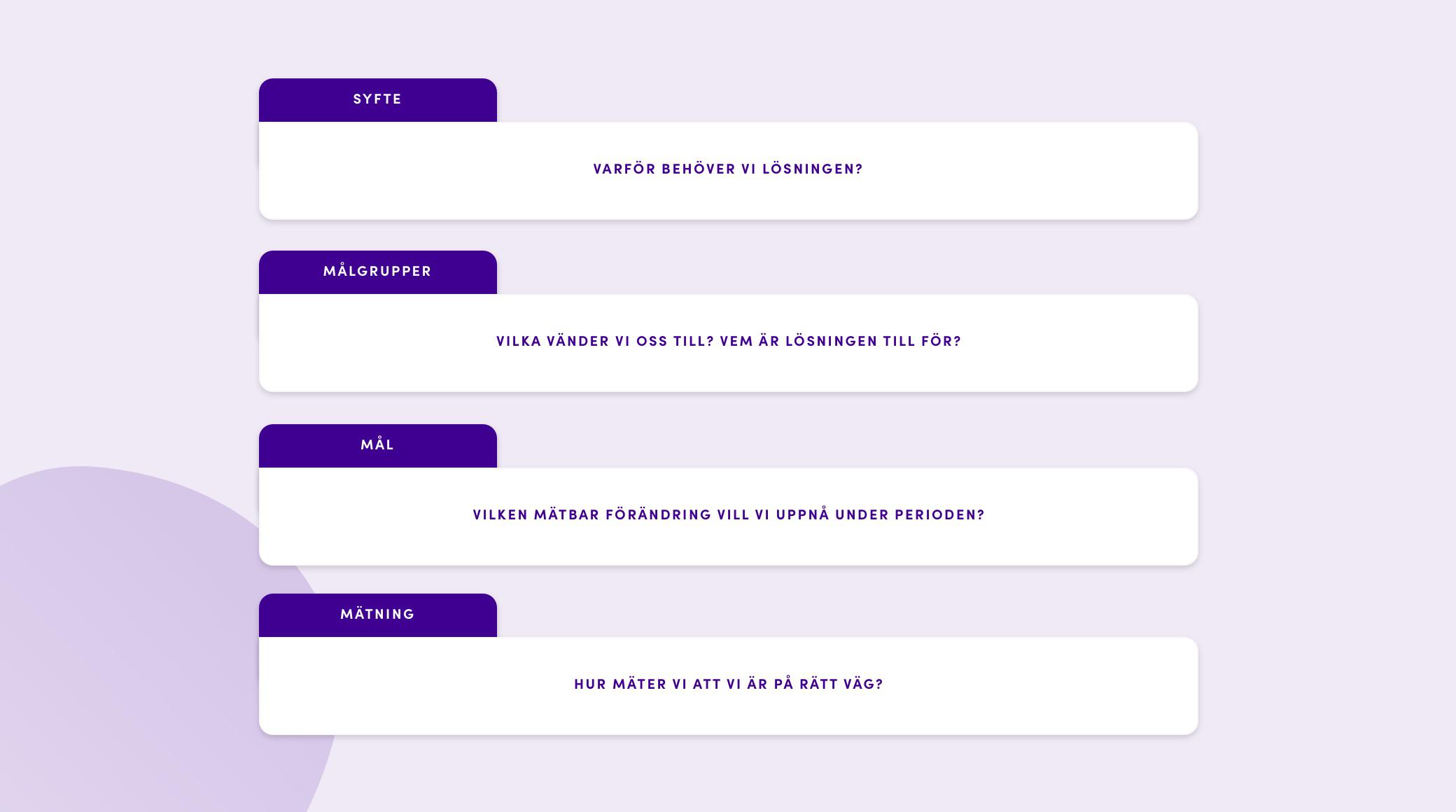 Workshopen är indelad i fyra delar: Syfte, målgrupp, mål och mätning